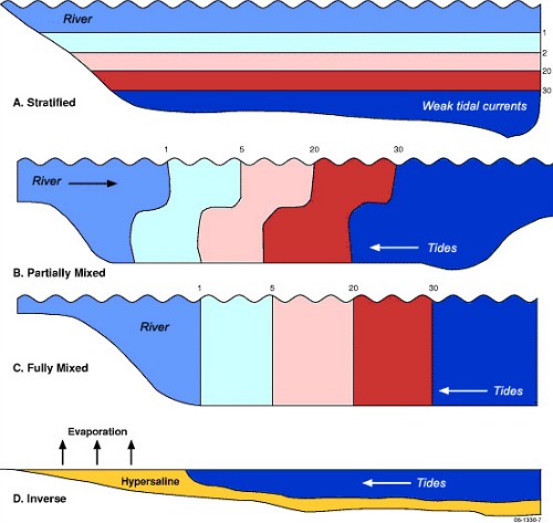 As discussed earlier, the characteristic types of salinity distributions in estuaries often depend on the driving force that mixes the estuary and includes: salt-wedge, partially mixed, well mixed, and inverse.